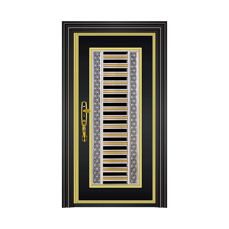 The door body of Painted Steel Entry Doors uses a stainless steel frame combined with tempered glass, which not only ensures safety but also achieves a lightweight design. The stainless steel frame has been specially treated to have excellent corrosion resistance and strength, while the tempered glass has extremely high impact resistance and safety. The surface of the colored steel plate door is flat and smooth, the color is bright and lasting, and it is matched with golden decorative lines, which is more high-end. The circular pattern design is playful and modern, which complements the overall style and takes into account both retro and modern aesthetics.